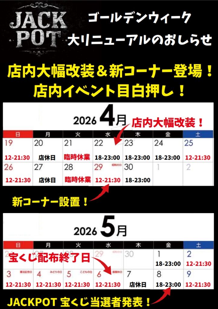 年末年始・ゴールデンウィークの営業情報は当店SNSをご覧ください。